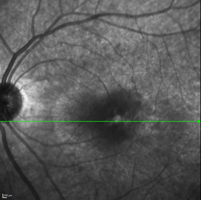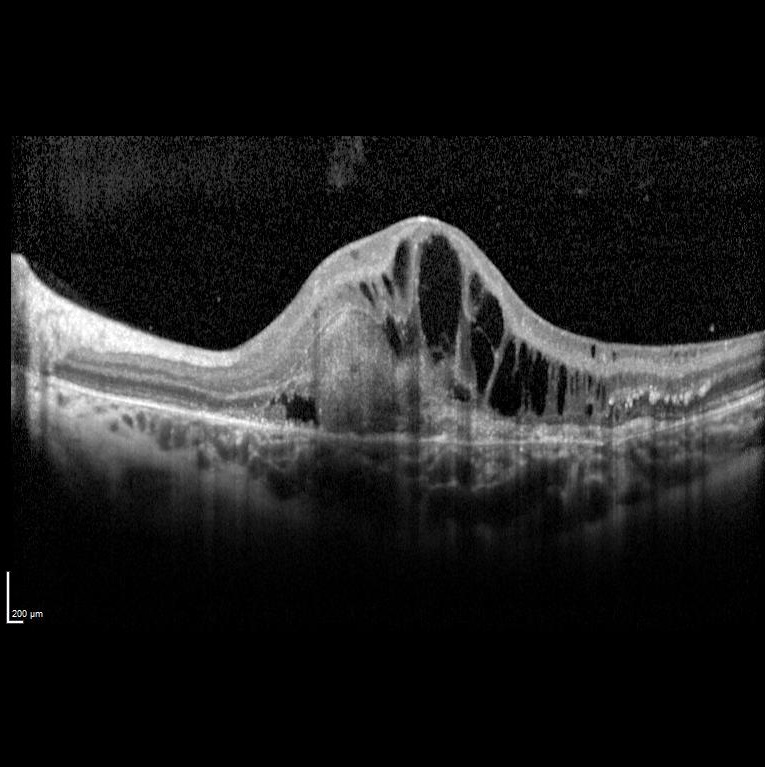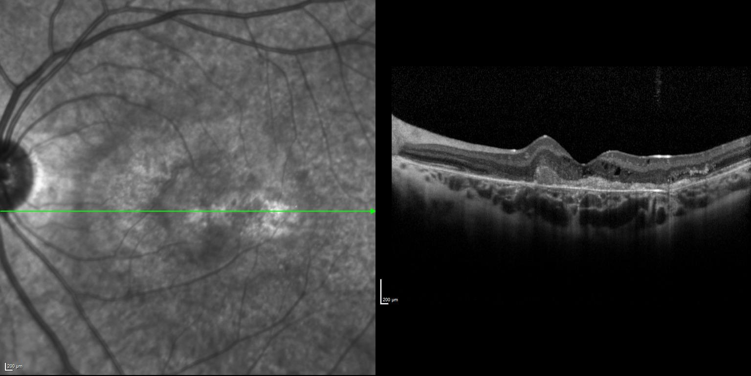Sol gözde bir haftadır görme azlığı şikayeti başlayan ve görme keskinliği 5 mps düzeyinde olan 15 yaşındaki kadın hasta retina kliniğimize refere edilmiştir. Hastanın renkli fundus ve optik koherens tomografi görüntülerini görmektesiniz. Hastanın doğumunda bir enfeksiyon öyküsü vardır. Sistemik bir hastalığı yoktur. Bu bulgulara göre tanınız nedir? Lütfen cevabınızı aşağıya yazınız.